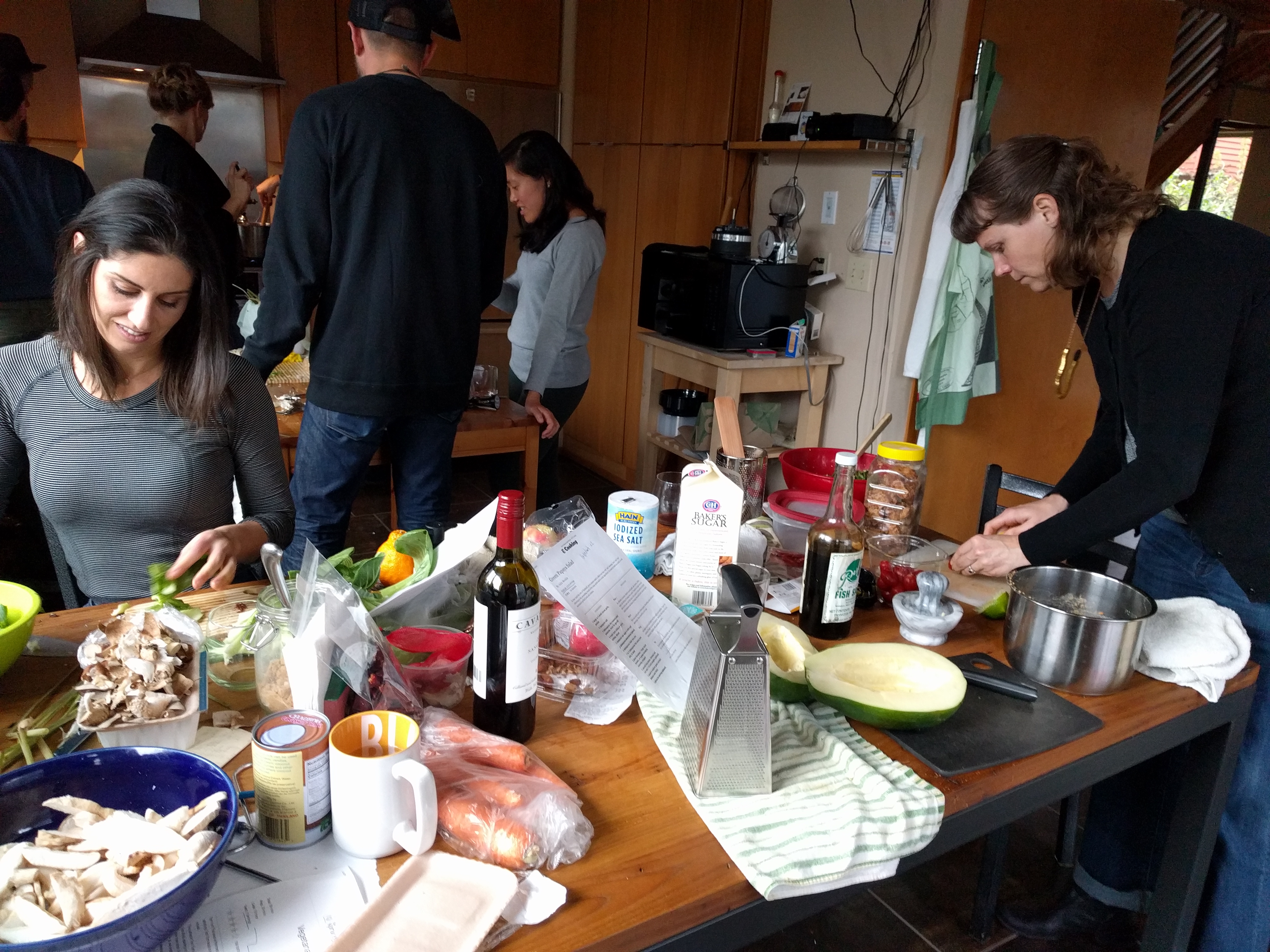 Once or twice a month, on a Sunday evening, a group of about 6–12 people convenes at a house in Seattle's Central District. The ingredients have been purchased and a menu has been set, based on a theme—like “Spain” or “Pineapples and Coconuts.” The group breaks into 3–5 teams of 2–3 people, and we set to work.